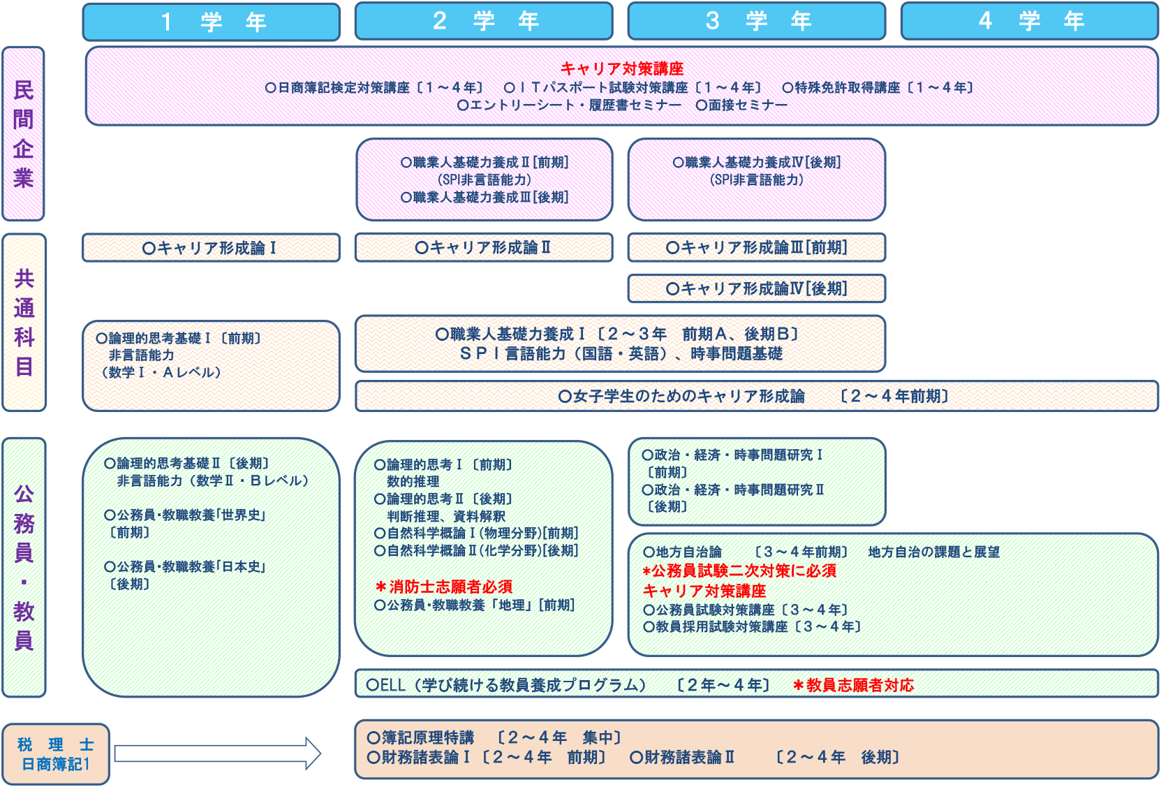 | 2年次 | キャリア形成論Ⅱ | 共生社会論 企業法務論 地方自治論 政治・経済・時事問題研究Ⅰ・Ⅱ 起業家育成論 起業ファイナンス論 | 職業人基礎力養成Ⅰ・Ⅱ・Ⅲ・Ⅳ 論理的思考基礎Ⅰ・Ⅱ 論理的思考Ⅰ・Ⅱ ビジネス能力開発論 メンタルマネジメント論 | 女子学生のためのキャリア形成論 グローバルキャリア論 ことばと文化 金融と人生設計 資本市場の役割と証券投資 |