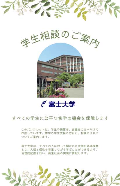 | 申込方法 | 直接相談室に出向くか、看護師(保健室)に申し込んでください。 メールでも相談予約を受け付けます。 soudan@fuji-u.ac.jp |