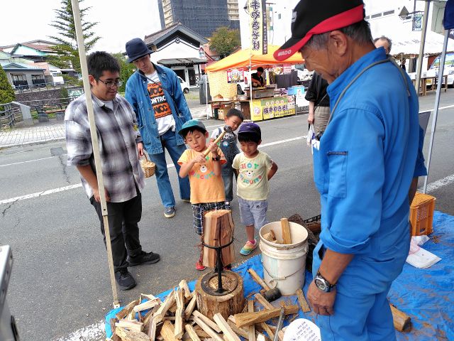 ブースでは、①ペットボトルキャップ ワークショップ、②薪割り体験、③ロケットストーブ利用体験、④富士大学学園祭「紫陵祭」開催案内、⑤大学紹介を行いました。