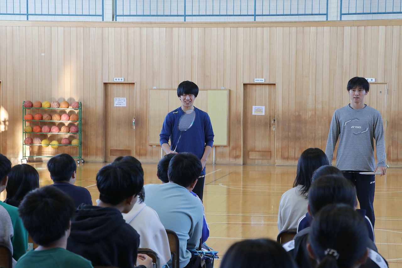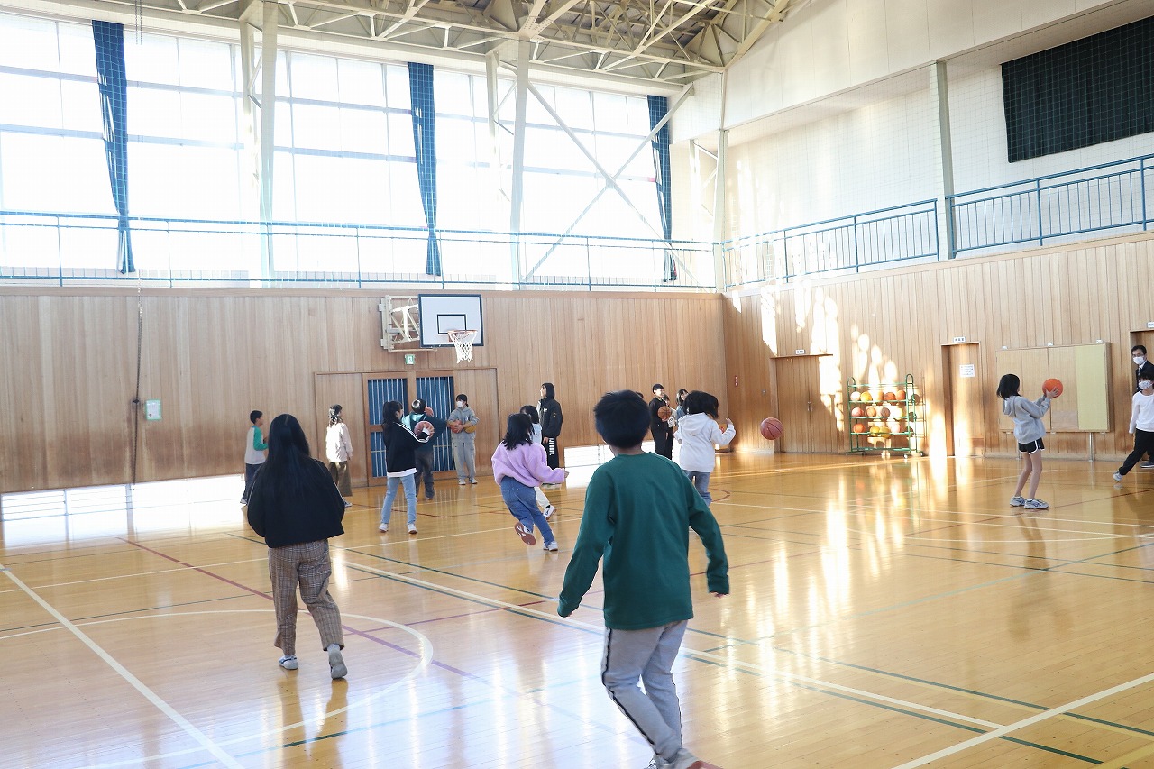 今回は、将来教員を目指す本学学生6名が講師として参加しました。講師紹介の後には、バドミントン部、硬式野球部、女子バスケットボール部の順にデモンストレーションが行われ、児童たちはキャッチボールやバドミントンのラリーを真剣な表情で見つめていました。さらに、バスケットボール体験では、2人1組になってパスからシュートまでを体験し、体育館が活気にあふれました。