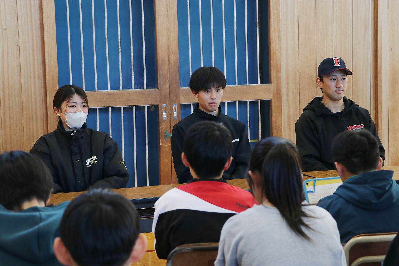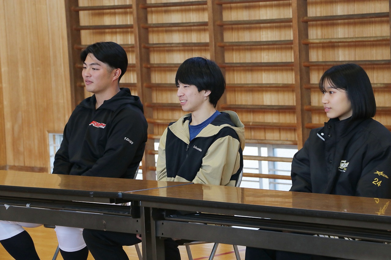 実演後は、2グループに分かれてディスカッションを実施。最初は緊張した様子も見られましたが、児童からは「将来の夢は何ですか」「学生生活で大変なことはありますか」「心がけていることはありますか」など多くの質問が寄せられ、学生たちは一つひとつ丁寧に答えていました。特に、親元を離れて夢に向かって努力している姿勢から、「親のありがたさ」や「周囲への感謝を忘れない気持ち」が伝わる内容となりました。