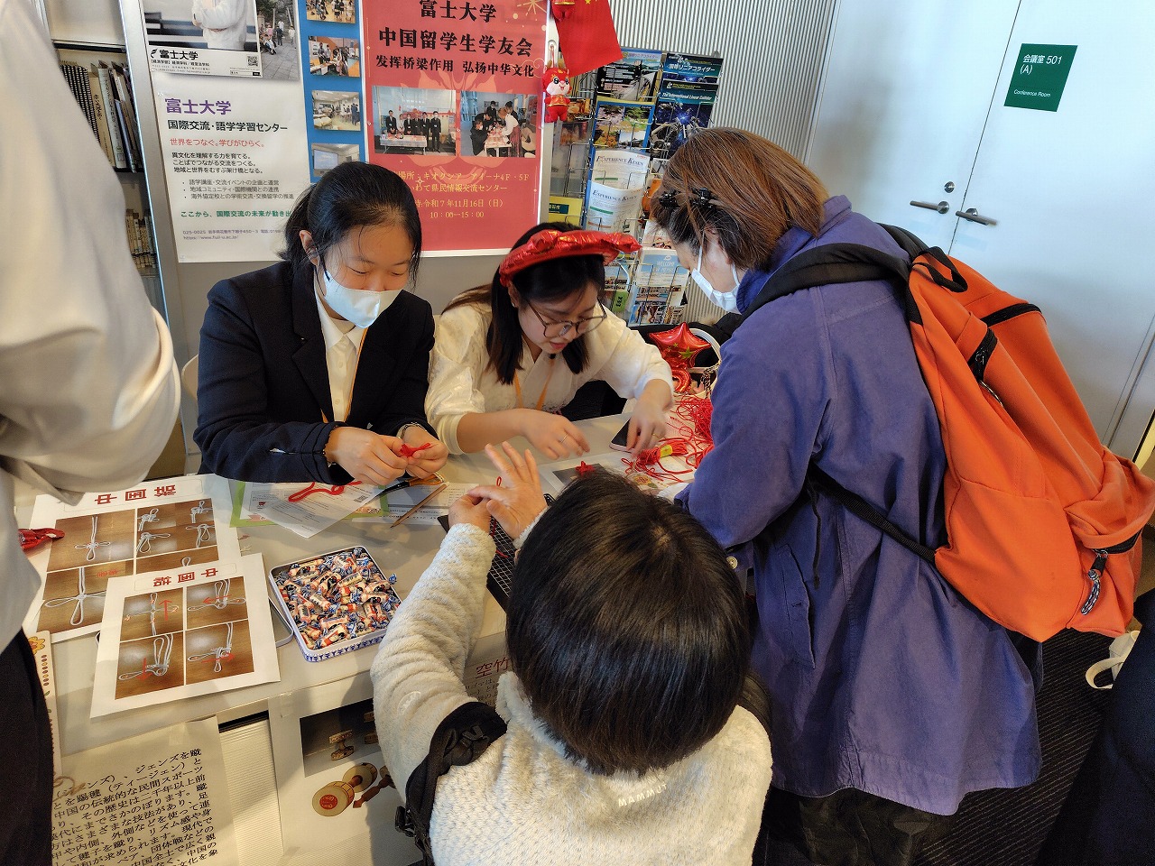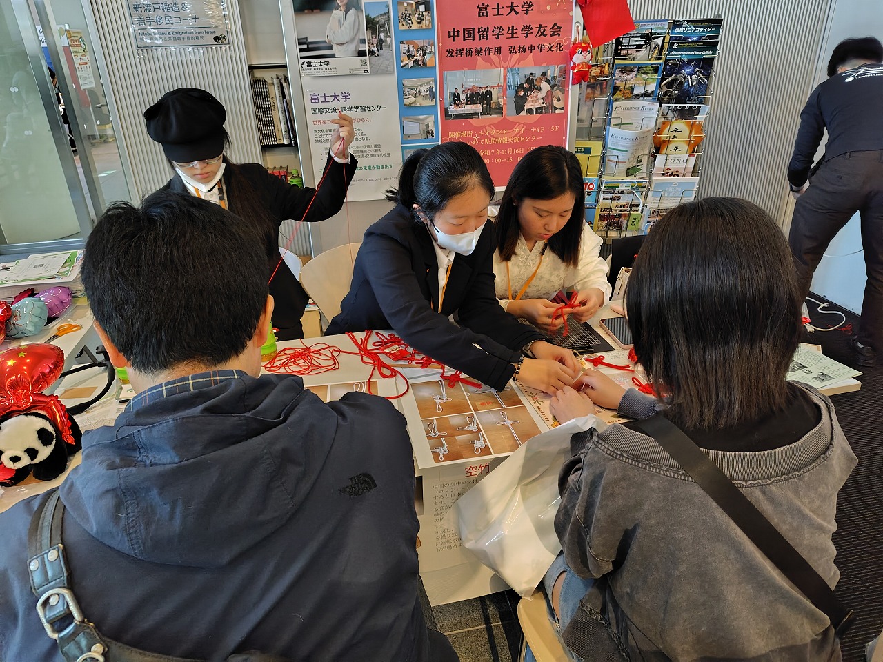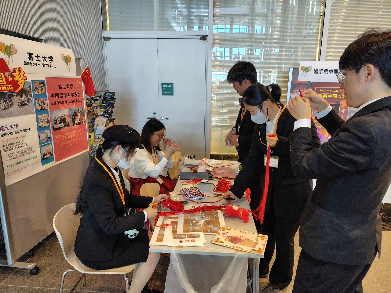 本学の中国人留学生は、富士大学国際センターブースを担当し、中国の伝統工芸である「中国結」の作り方を紹介しました。「中国結」は紐を編んで作る工芸品で、5~10分ほどで体験でき、団結・幸福・愛・健康・繁栄・長寿などの吉祥を象徴する縁起物として親しまれています。