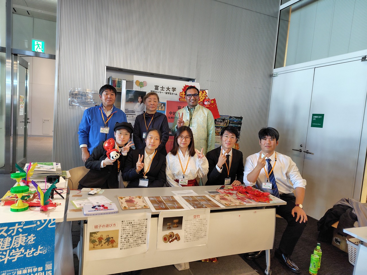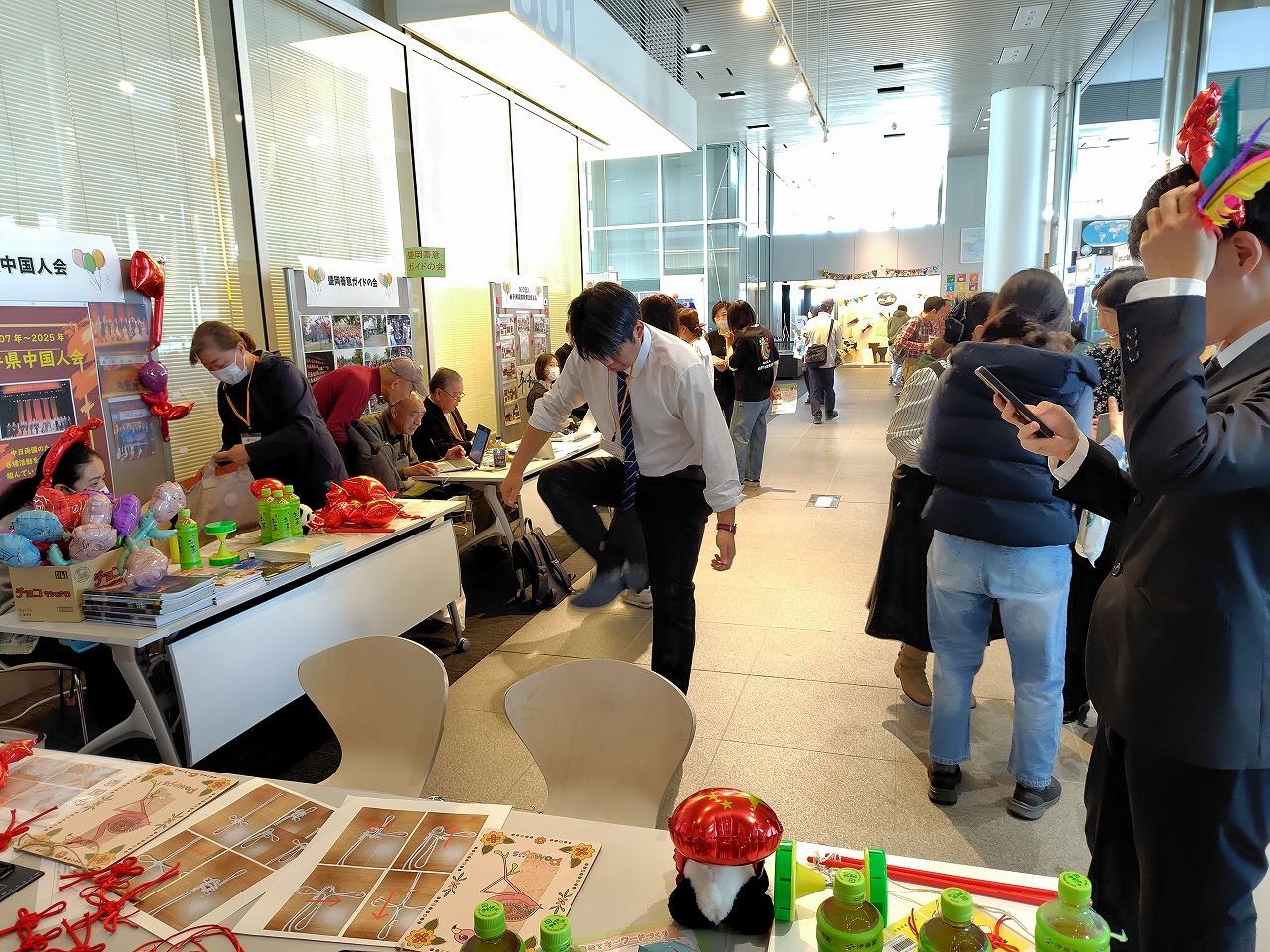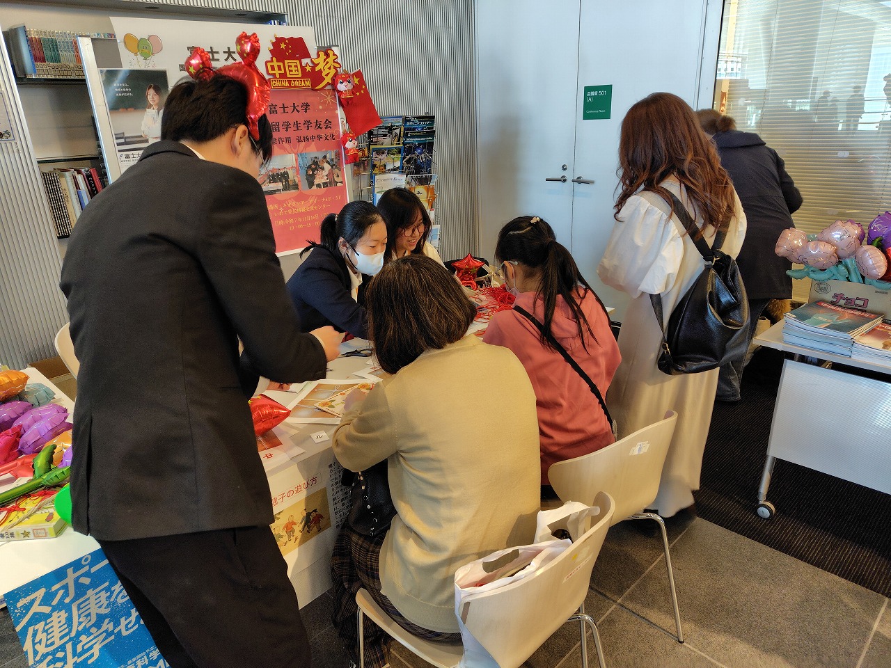 本学の中国人留学生は、富士大学国際センターブースを担当し、中国の伝統工芸である「中国結」の作り方を紹介しました。「中国結」は紐を編んで作る工芸品で、5~10分ほどで体験でき、団結・幸福・愛・健康・繁栄・長寿などの吉祥を象徴する縁起物として親しまれています。