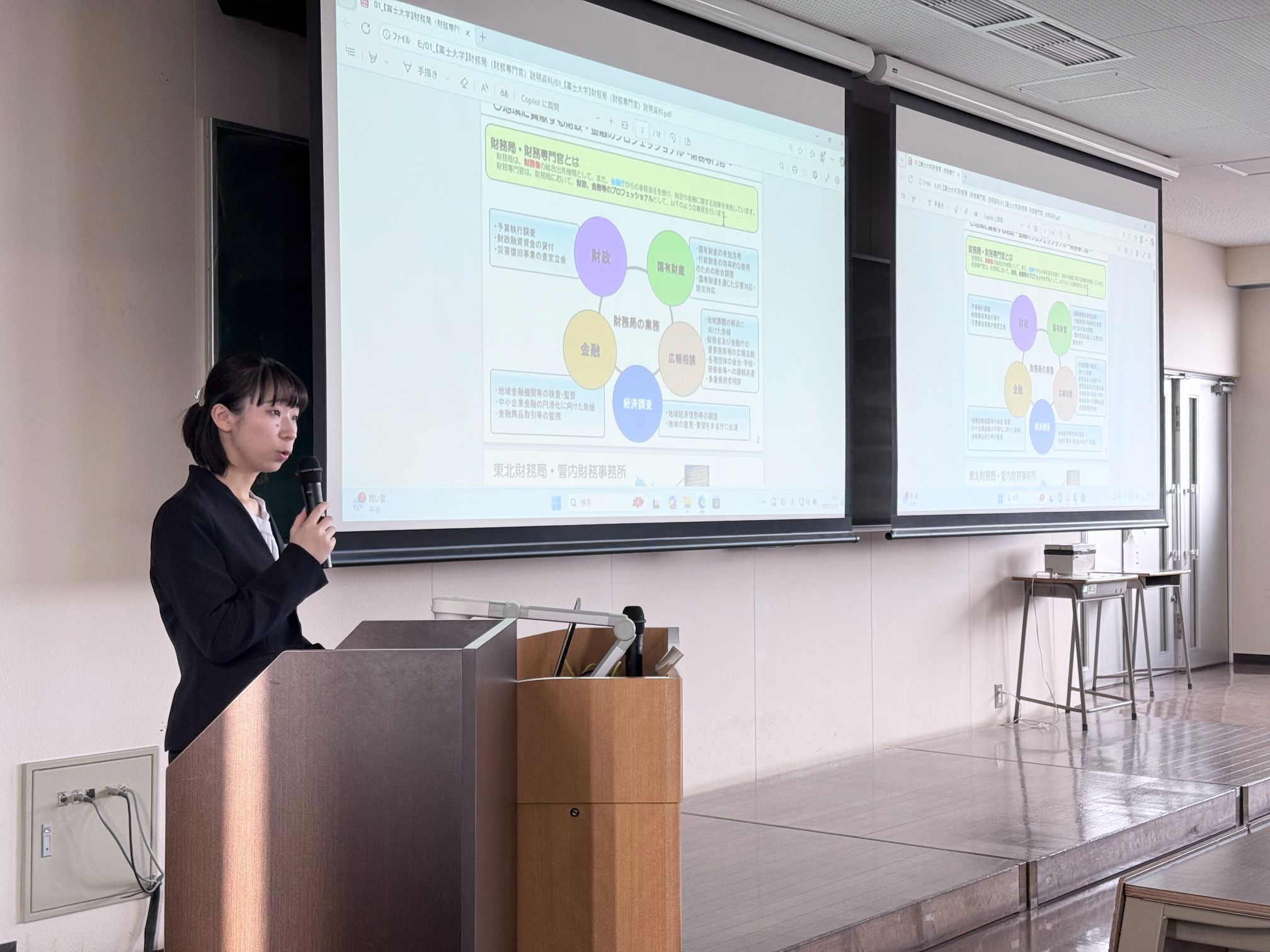 12月12日(金)のキャリア形成論では、東北財務局総務部人事課の担当者をお招きし、「財務省東北財務局について~財務局職員(財務専門官)になるためには~」をテーマにお話いただきました。